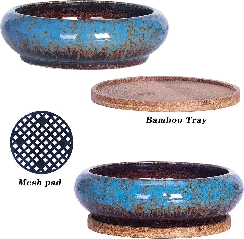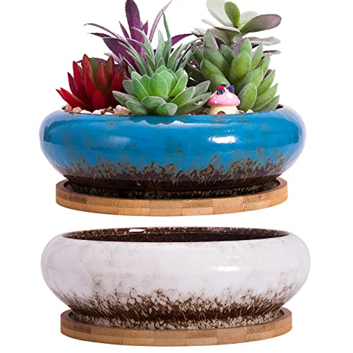 Succulent Pots, 7.3 Inch Succulent Planter Pots with Drainage Hole Pack of 2, Shallow Bonsai Pots with Tray Ceramic Flower Plant Pots for Indoor/Outdoor